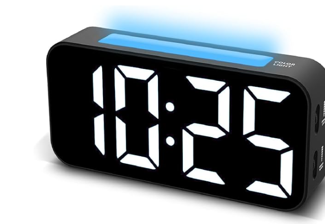 This large 7-inch LED alarm clock makes time easy to see, even from across the room. With three volume settings, including extra loud for heavy sleepers, plus a big snooze button and adjustable night light, it’s perfect for any bedroom.